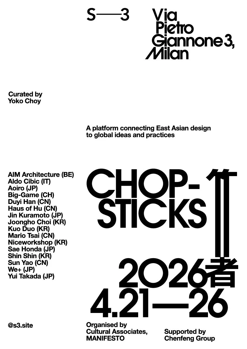 “CHOPSTICKS 箸” is the first initiative developed by S—3. Curated by Yoko Choy, it brings together 16 creatives from China, Japan, South Korea and beyond to create their own interpretations of chopsticks: 11 product designers and studios exploring context and form, three graphic designers contributing visual responses, and one spatial and one olfactory studio shaping the exhibition experience for its debut at Milan Design Week. S—3 is a platform connecting East Asian design with global ideas and practices, co-founded by Cultural Associates and MANIFESTO.