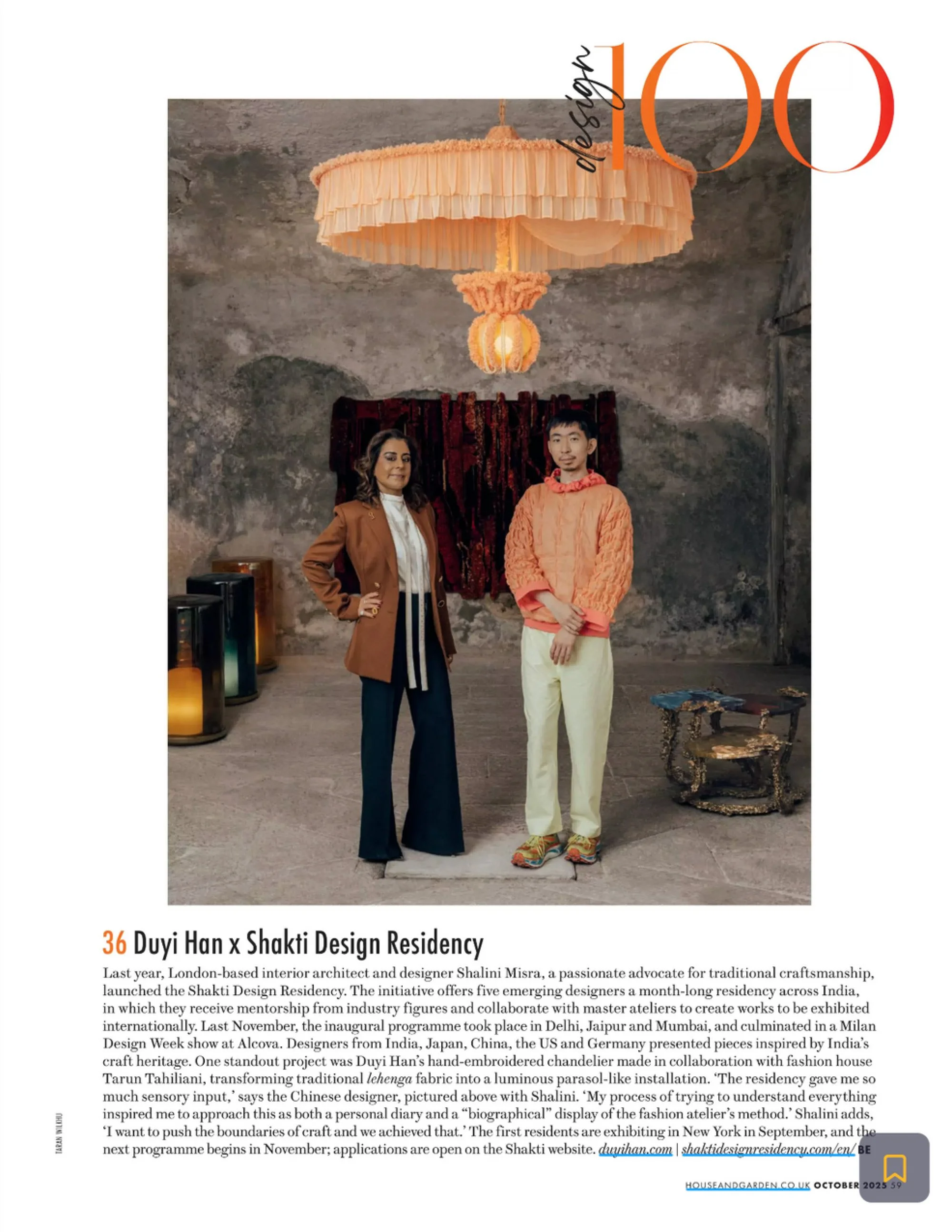 Chinese designer Duyi Han with the hand-embroidered fabric chandelier that he designed while participating in the first Shakti Design Residency