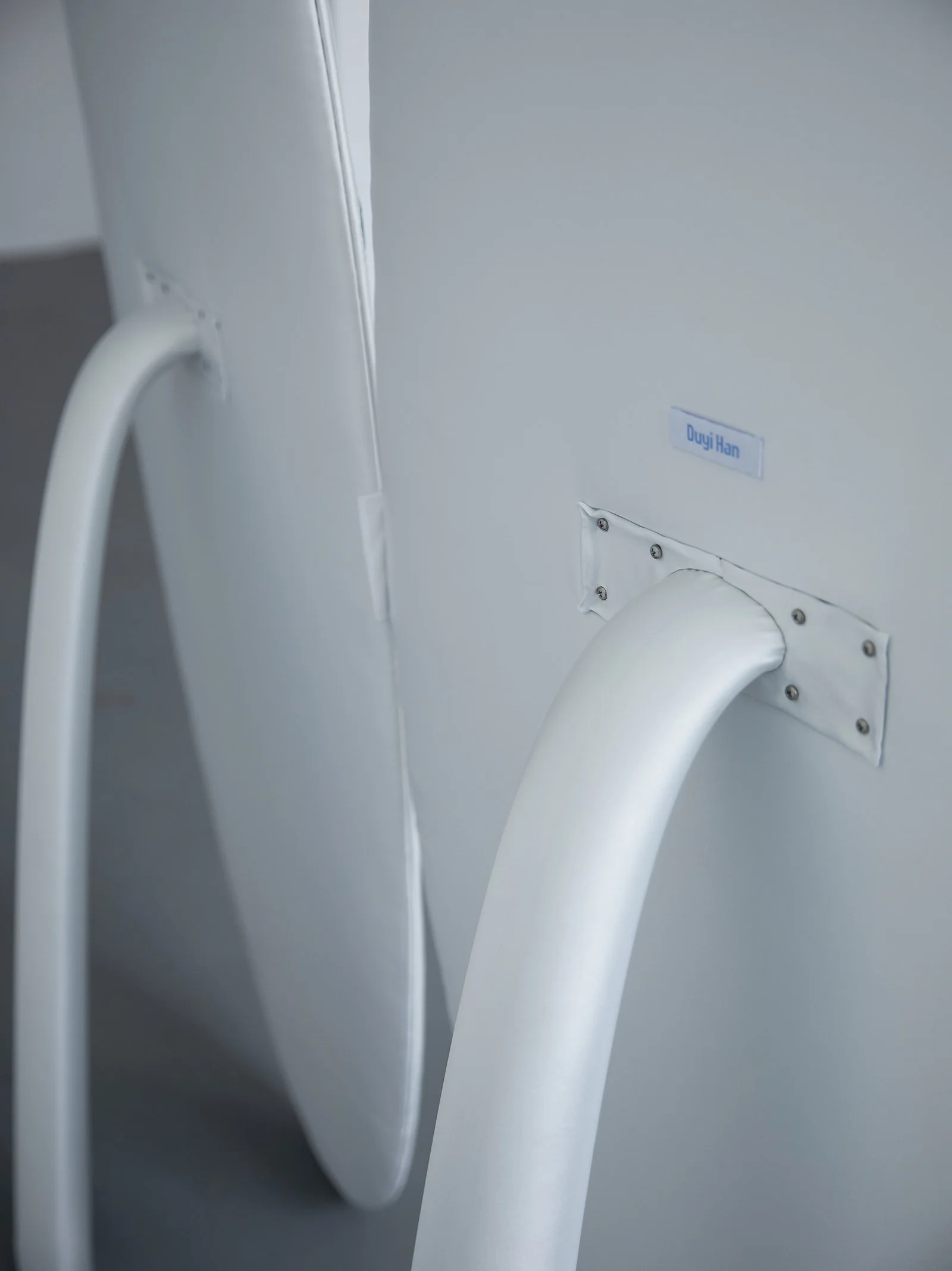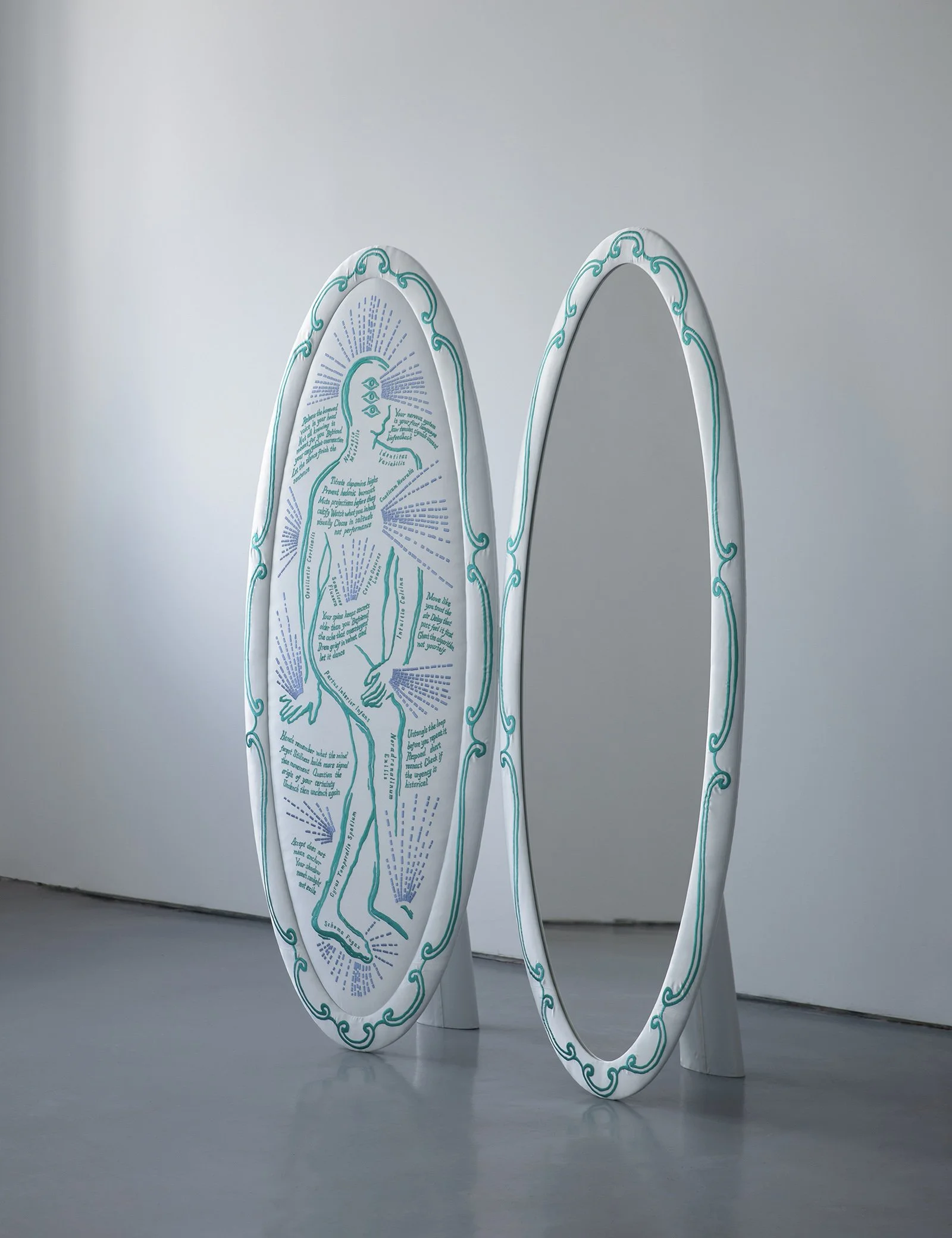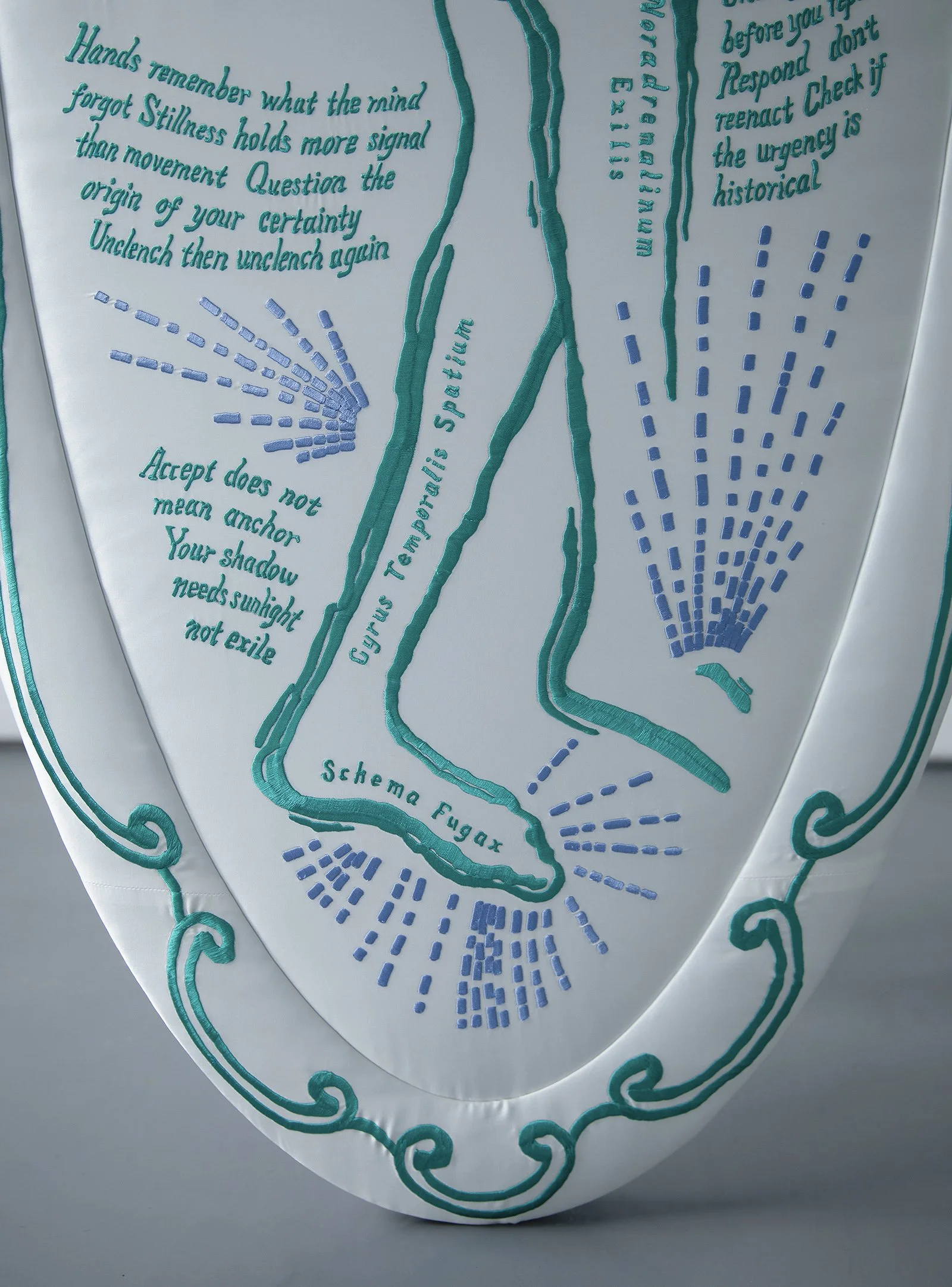 Noetigram v0.9 is a dual-surface instrument that augments the act of self-observation with a psychological dimension. Its design emerged through a recursive process of looking—tracing the visual lineage of anatomical diagrams, occult manuscripts, and contemporary wellness interfaces as systems for mapping the interior. Rooted in the human drive for self-clarity, this process ultimately turned algorithmic as AI produced a series of self-check phrases annotating a life-sized humanoid figure embroidered on cool-white satin with diagrammatic light rays. Inspired by neurobiology, cognitive therapy, and somatic science, each phrase acts as a micro-instruction for inner calibration. One half diagram, one half glass mirror, the work is a surreal-romantic interface for consciousness—inviting viewers to audit their internal structures beside physical reflection.